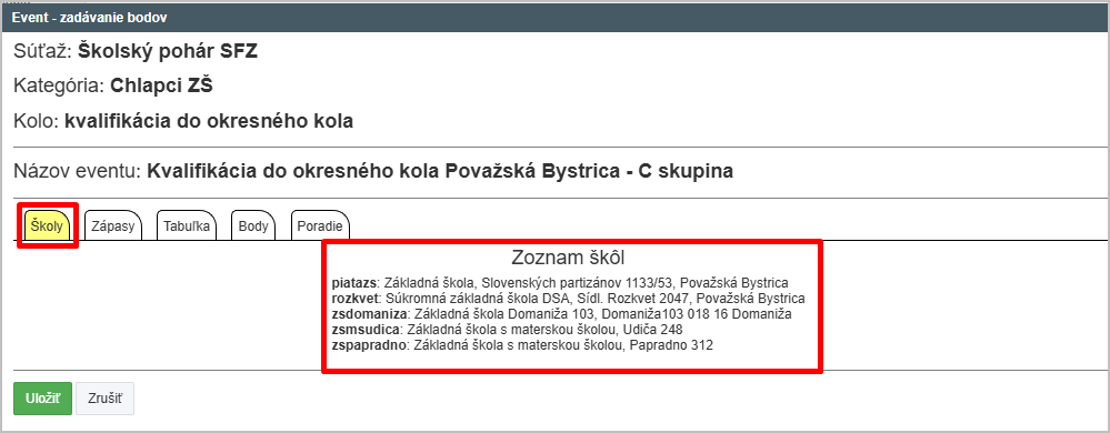 Druhá Zápasy je prostredie na zapisovanie vzájomných zápasov škôl. Jednoduchým výberom dvojice škôl je mopžné pridať zápas a zapísať vzájomné skóre. Vzájomné zápasy a skóre je potrebné Uložiť.
