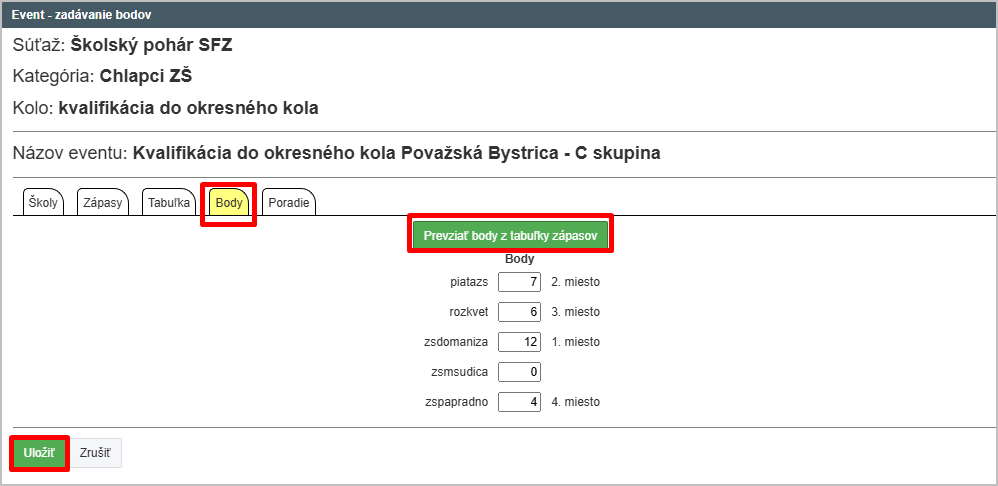 ŠtvrtáBody umožňuje zo zapísaných zápasov priradiť školám výsledný počet bodov kliknutím na Prevziať body z tabuľky zápasov Ak organizátor vzájomné zápasy nezapísal, vie body zadať ručne. Ak chce organizátor iba vytvoriť poradie škôl (bez zápisu zápasov či získaných bodov, môže víťaznému družstvu zapísať najviac bodov, druhému v poradí o jeden menej, ďalšiemu opäť o jeden menej a pod. Tým sa vytvorí poradie. Zápis bodov je potrebné Uložiť.