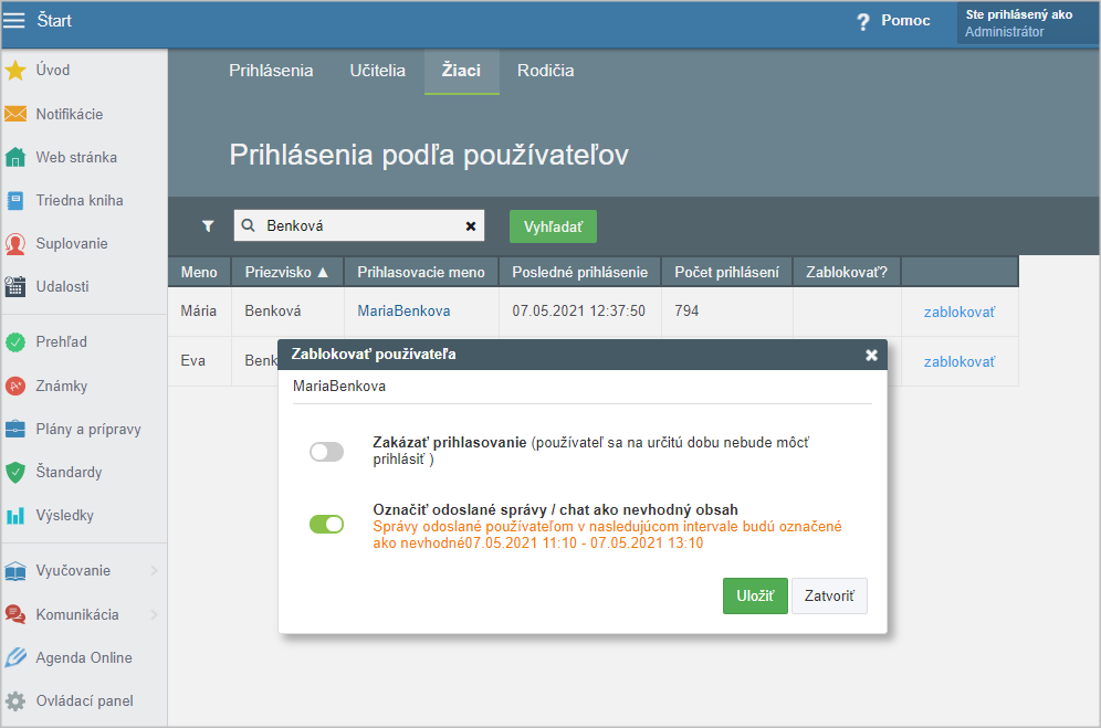 Tu vidíte, dokedy je používateľ blokovaný, tj. dokedy sa nebude vedieť prihlásiť do EduPage.