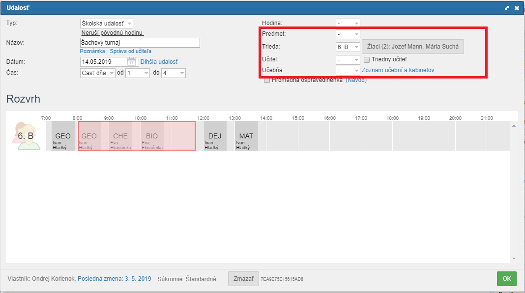 Ak máte vytvorené "moje hodiny": Učiteľ - čo je to hodina a ako si ju vytvoriť?, môžete si vytvoriť udalosť iba pre žiakov danej hodiny: