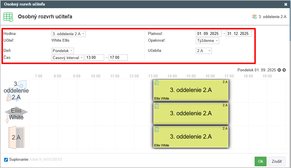 Môžete si pomôcť s funkciou Duplikovať, pomocou ktorej urobíte kópiu rozvrhu a zmeníte údaje, ktoré je treba zmeniť, napr. deň alebo čas.
