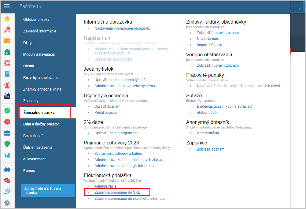 Vyberte Špeciálne stránky/Záujem a prijímanie do ŠKD (príp. Záujem a prijímanie do školského internátu).