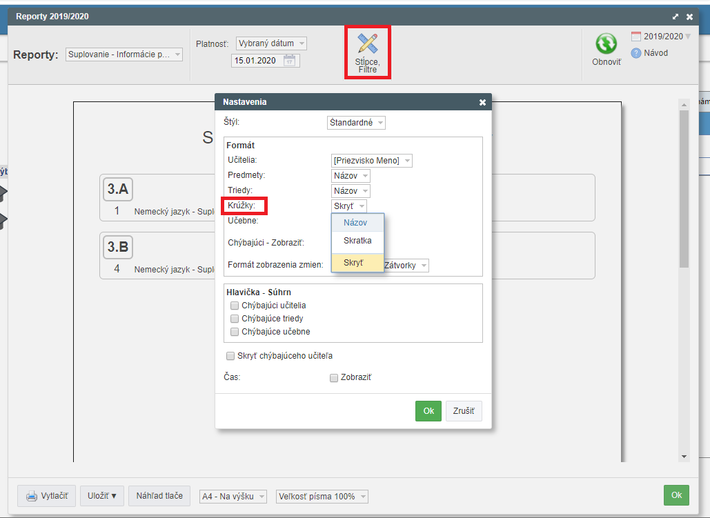 V tlači suplovania pre žiakov (Suplovanie - Vytlačiť - Dnešné suplovania-informácie pre študentov ) v nastaveniach "Stĺpce,Filtre" taktiež nezabudnite skontrolovať nastavenie krúžkov.