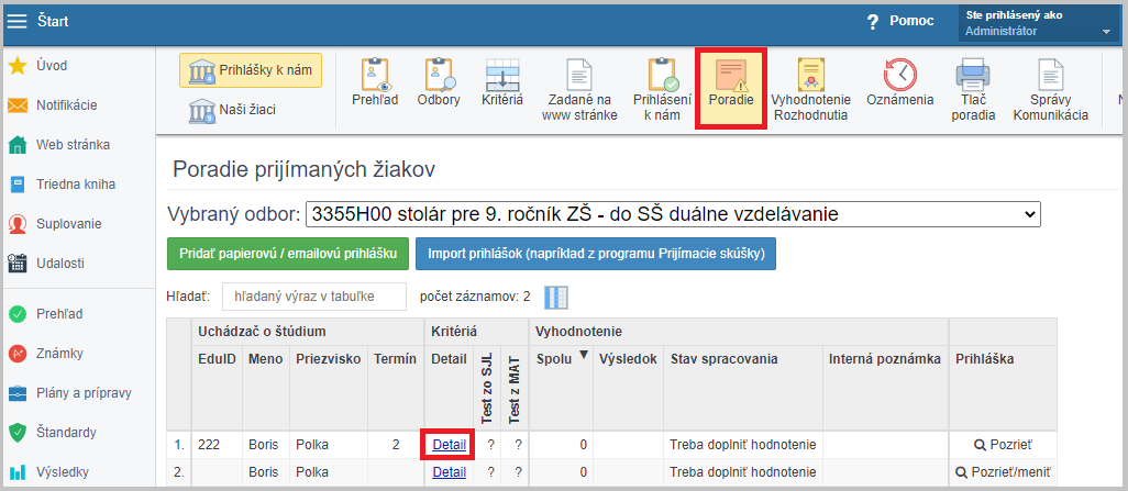 V časti "Poradie" kliknite na "Detail" pri uchádzačovi, ktorému chcete zapísať výsledok z prijímacej skúšky.