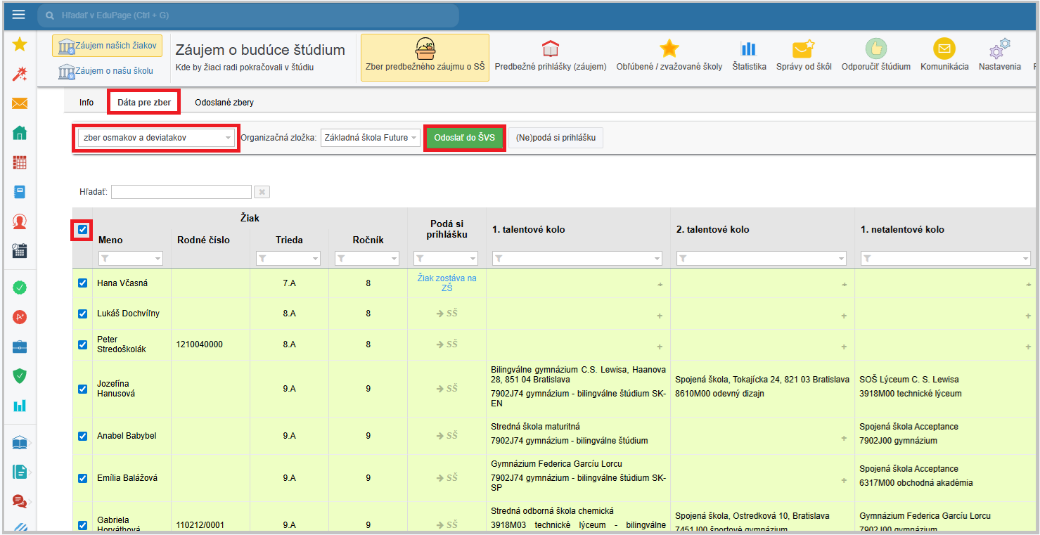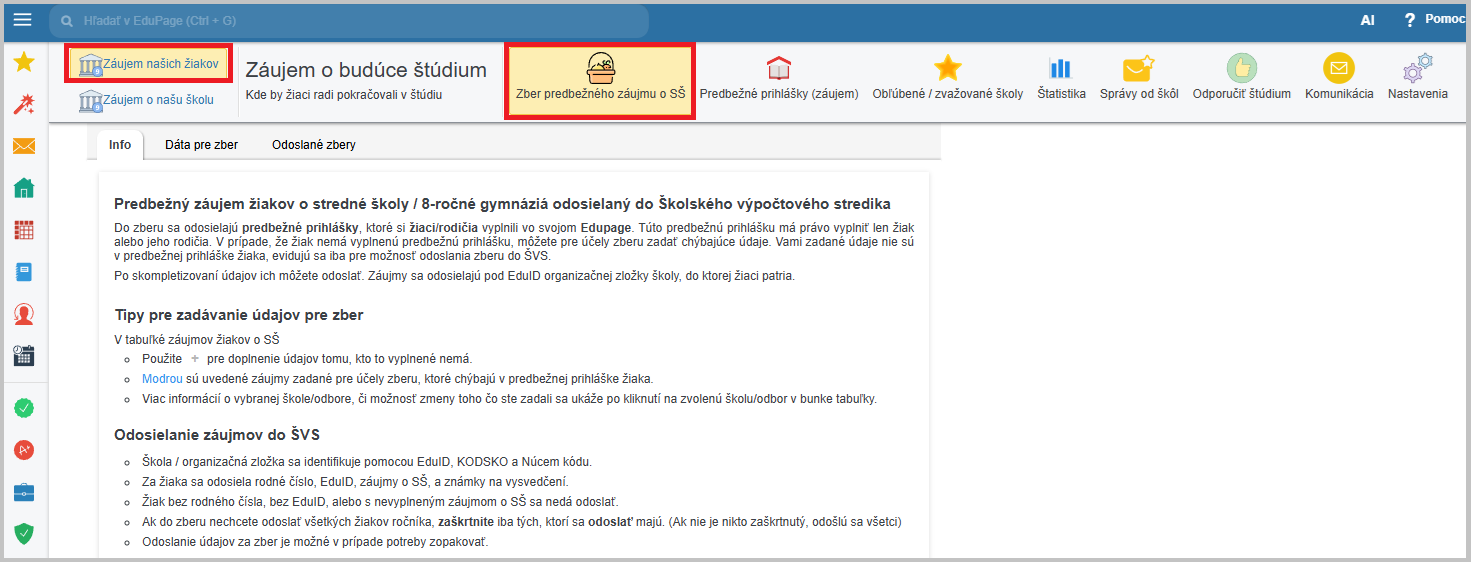 V module Záujem o štúdium v hornom menu vyberte Záujem našich žiakov/Zber predbežného záujmu o SŠ.