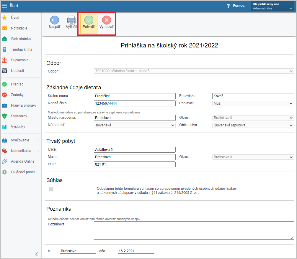 Keďže tento modul je viditeľný pre všetkých, niektoré prihlášky môžu byť podané napr. zo žartu. Preto treba prejsť všetky prihlášky. Kliknite na meno, otvorí sa vám prihláška. Prihlášku môžete potvrdiť alebo zmazať.