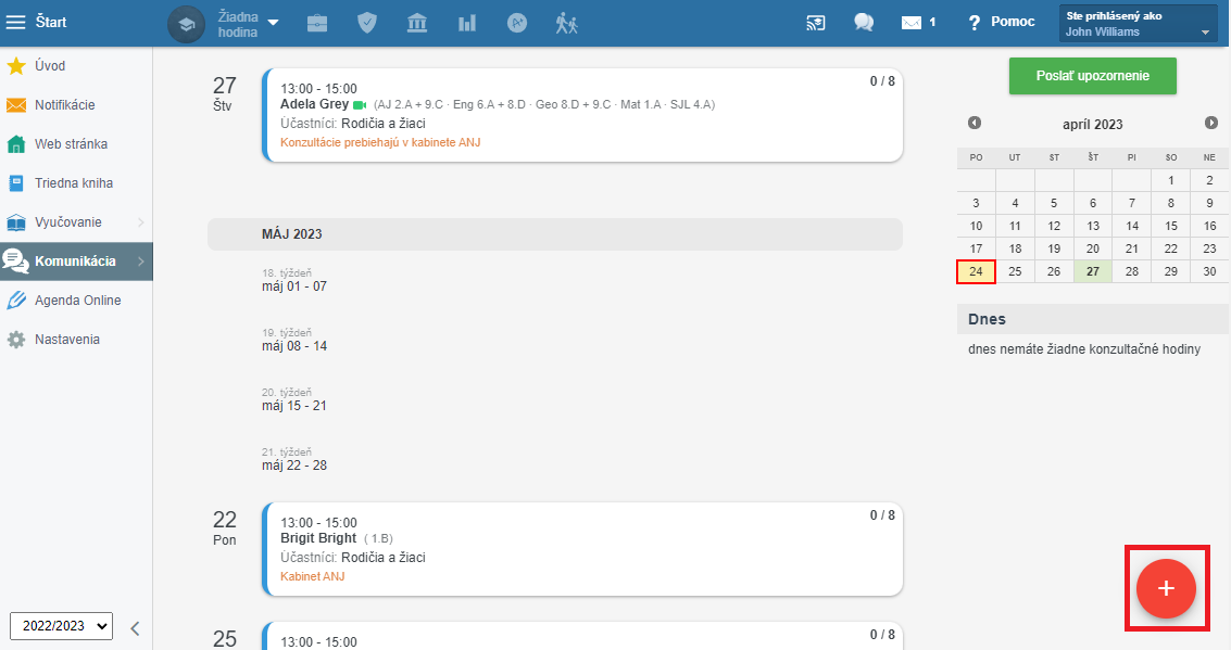 Zadajte čas konania konzultačného rodičovského združenia a trvanie jednej konzultácie v minútach. Je možné zakázať prihlasovanie rodičov na konzultácie pred a po určitom dátume.