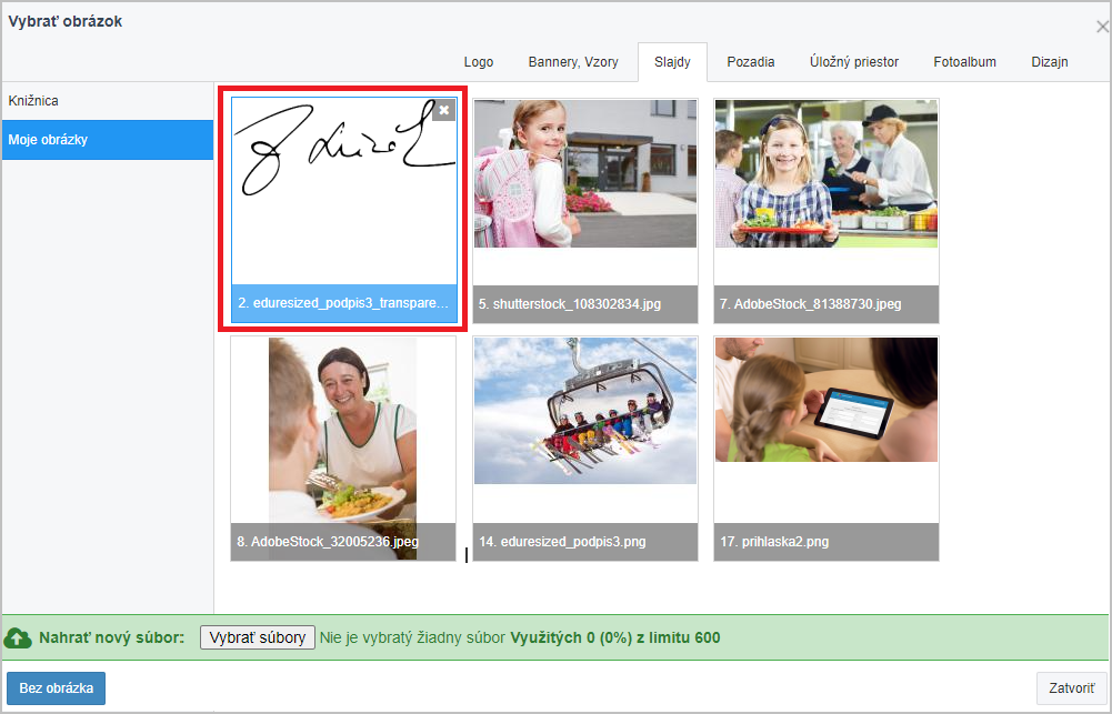 Obrázok sa objaví v parametroch diplomu. Obrázok si systém zapamätá, to znamená, že keď budete najbližšie pripravovať pre žiakom diplomy, podpis vám systém ponúkne, nie je potrebné nahrávať ho znova.