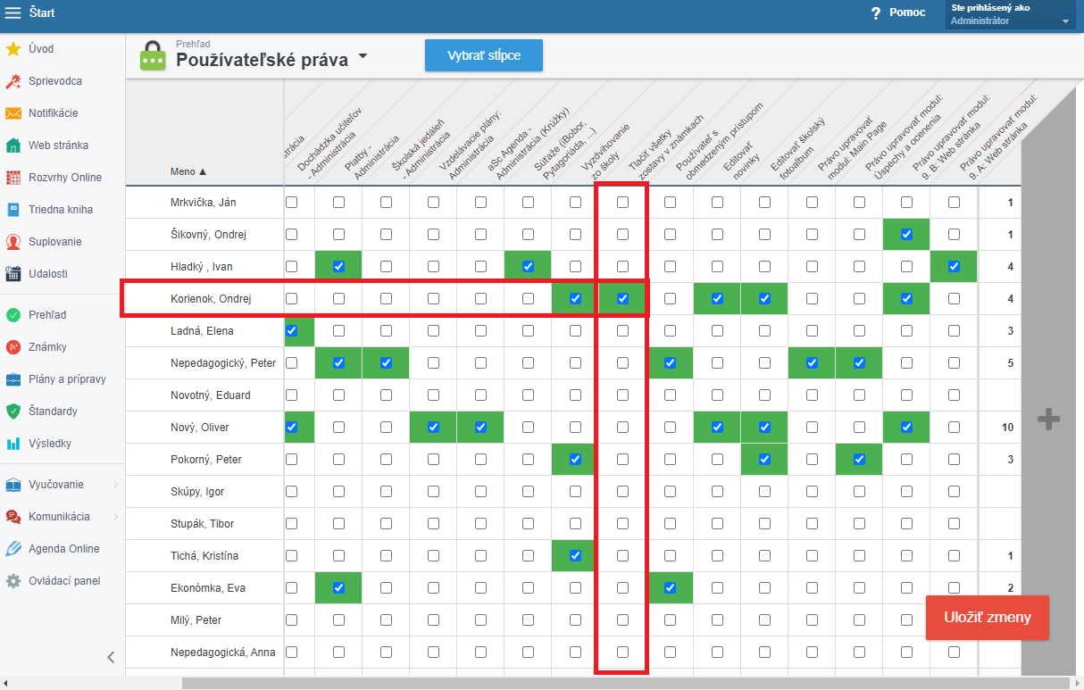 Učiteľovi môže administrátor prideliť právo na tlač všetkých zostáv v známkach cez Prehľad - Používateľské práva: