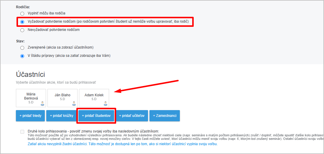 V sekcii Rodičia zvoľte "Vyžadovať potvrdenie rodičom" a v sekcii Účastníci vyberte konkrétnych žiakov.