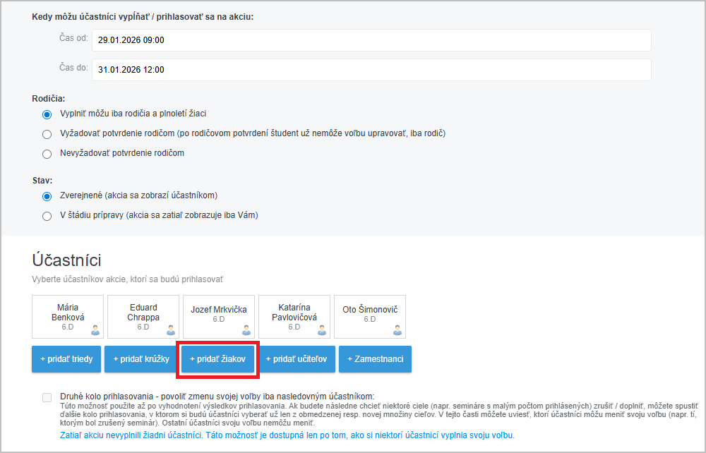Ako vytvoriť prihlasovaciu akciu/anketu iba pre vybraných rodičov?