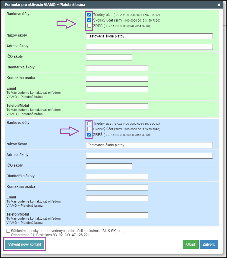V prípade, že sú rôzne kontaktné osoby pre aktiváciu, tak je možnosť pridať ďalší kontakt cez tlačítko Vytvoriť nový kontakt: