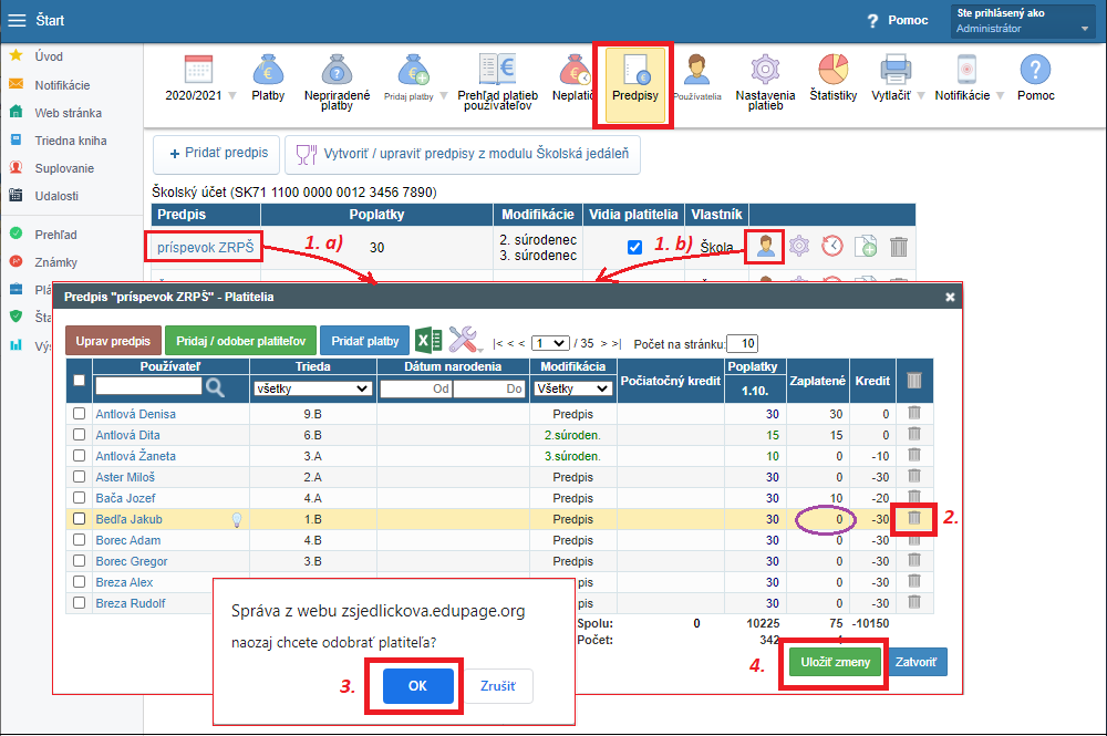 4. nakoniec treba ešte uložiť nový zoznam platiteľov, kde sa už žiak Bedľa Jakub nenachádza - zelené tlačidlo 'Uložiť zmeny'.