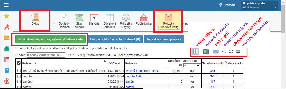 Každá položka = skladová karta musí byť naviazaná na nejakú potravinu.