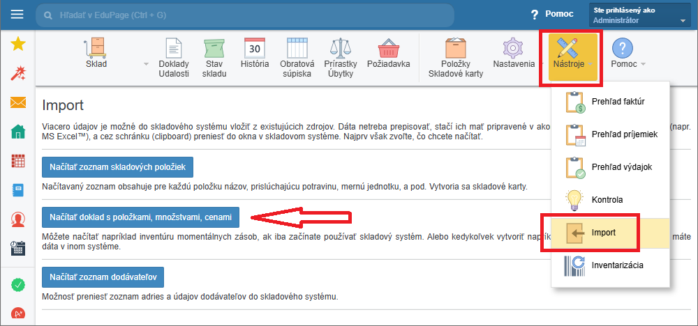 Pred importom odporúčame najprv si vytvoriť v EduPage Skladové karty - položky (aj tie je možné rýchlo nahrať zo zoznamu v Exceli).
