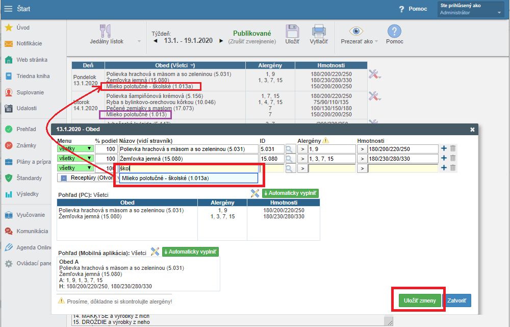 Pri tvorbe jedálneho lístka treba vyberať receptúru mlieko podľa toho, ktoré v daný deň podávate ('mlieko polotučné' s ID 1.013 alebo 'mlieko polotučné - školské' s ID 1.013a)