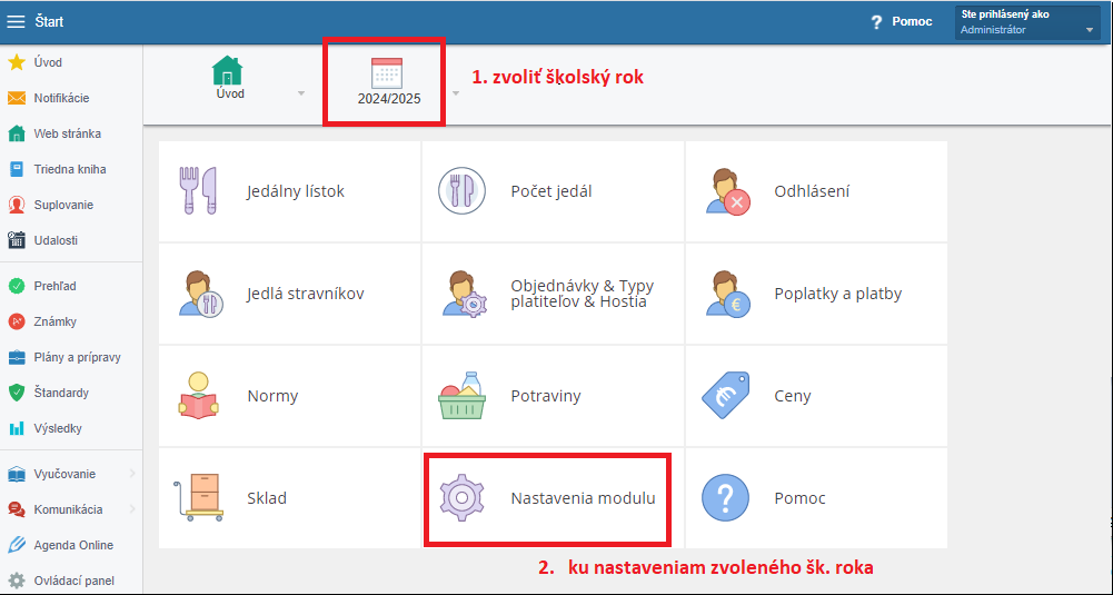 Nastavenia pre modul jedáleň si treba urobiť samostatne pre každý šk. rok.