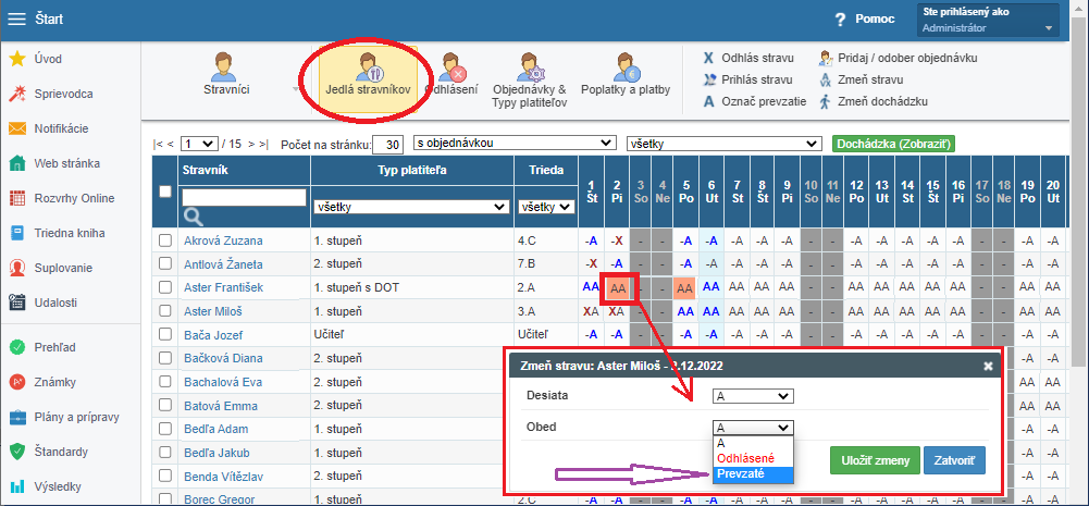 * ak škola ponúka viacej menu, dá sa zvoliť iba prevzatie konkrétneho menu