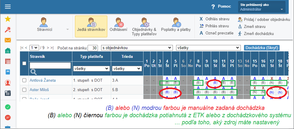 Pod skratkami pre objednané / odhlásené jedlá sa zobrazí riadok s dochádzkou - písmená v zátvorke.