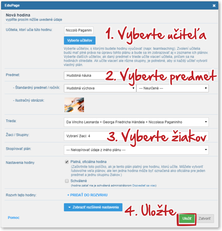 Pri výbere predmetu zvoľte predmet, ktorý sa má na hodine vyučovat, napr. Hudobná náuka.