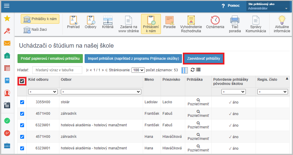 V menu nad tabuľkou vyberte možnosť "Zaevidovať prihlášky".