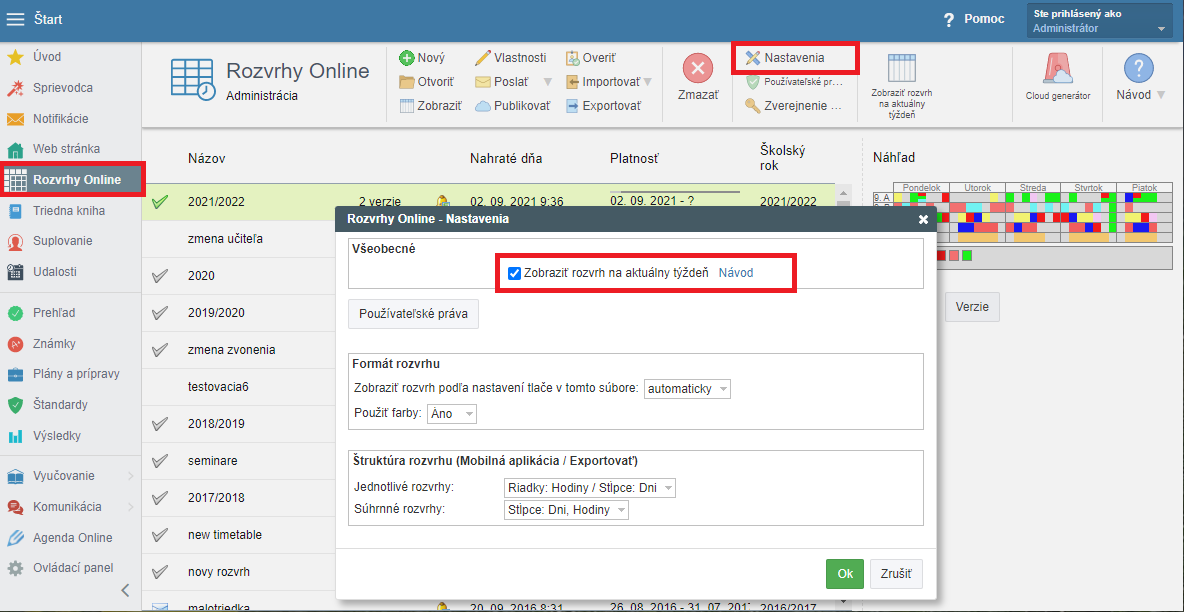 Funkciu zapnete v Online prehliadači rozvrhu - Nastavenia - "Zobraziť rozvrh na aktuálny týždeň":