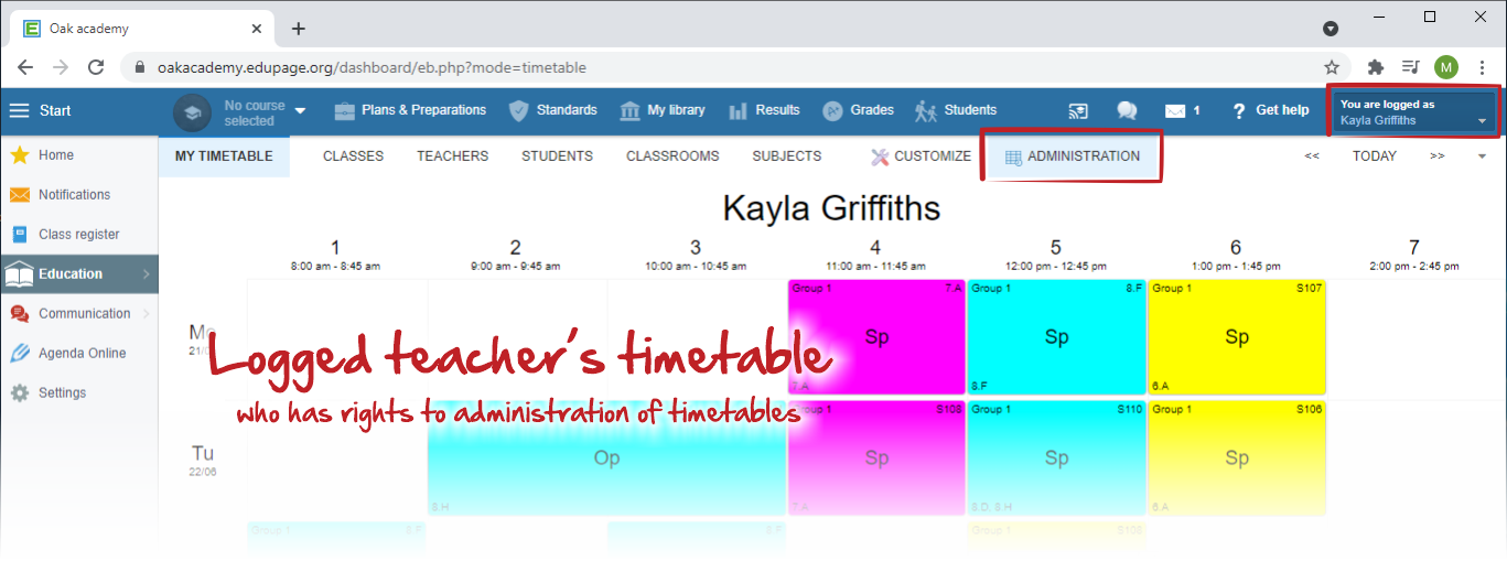 Učiteľ s týmito právami uvidí po prihlásení sa do svojho Edupage konta ikonku "administrácia" pri svojom rozvrhu. Prihlásiť sa môže jednoducho svojimi prihlasovacími údajmi, žiadne administrátorské heslo nie je potrebné.