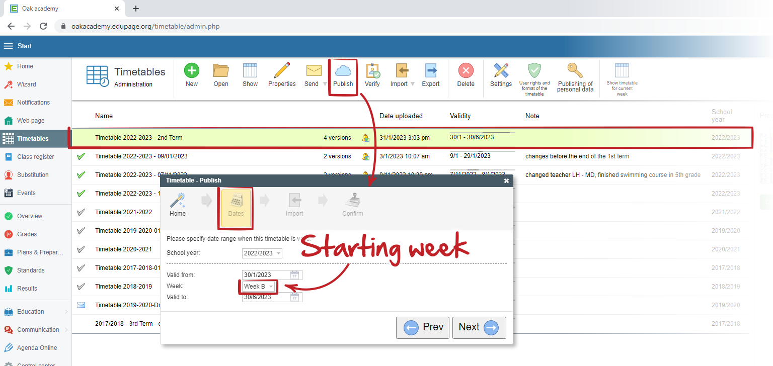 Ako nastaviť presný dátum zmeny týždňa alebo polroka v zverejnenom rozvrhu?