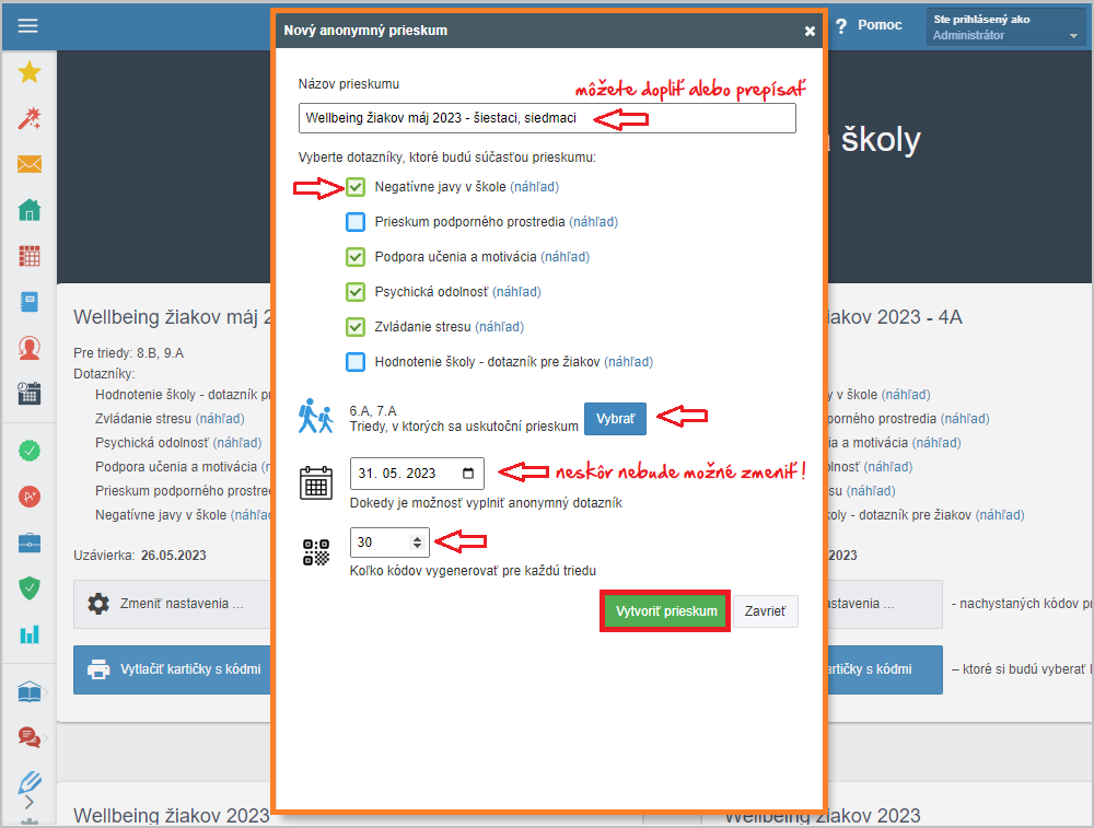 Prihláste sa do EduPage ako administrátor a v module Anonymný dotazník zvoľte kachličku Wellbeing a autoevalvácia školy: