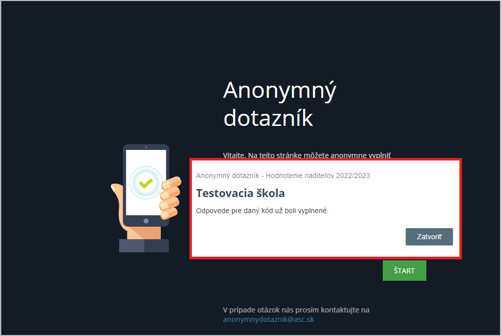 Po zadaní kódu sa otvorí okienko so základnými informáciami o dotazníku. Zeleným tlačidlom viete dotazník spustiť a odpovedať na pripravené otázky: