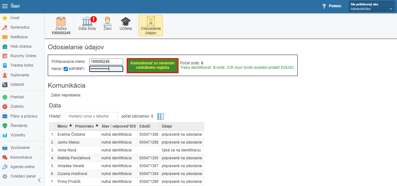 Vyplňte prihlasovacie meno a heslo (školám ich posiela Ministerstvo školstva) a kliknite na Komunikovať so serverom centrálneho registra.
