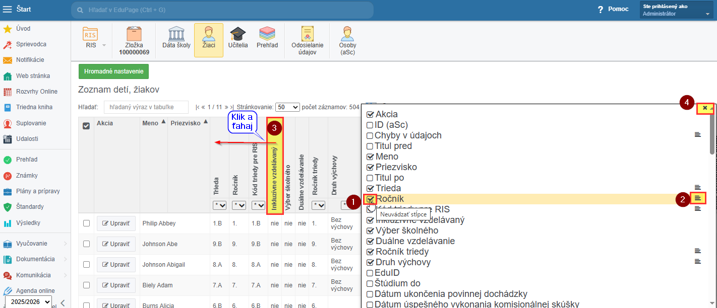 1. V module RIS kliknite na žiaci/učitelia. Zobrazí sa tabuľka s rôznymi stĺpcami a údajmi v nich. V riadkoch sú zobrazení žiaci/učitelia podľa abecedy. Aby ste si tabuľku mohli prispôsobiť vašej aktuálnej potrebe, kliknite na sivomodrú ikonu - Uvádzať stĺpce (1).