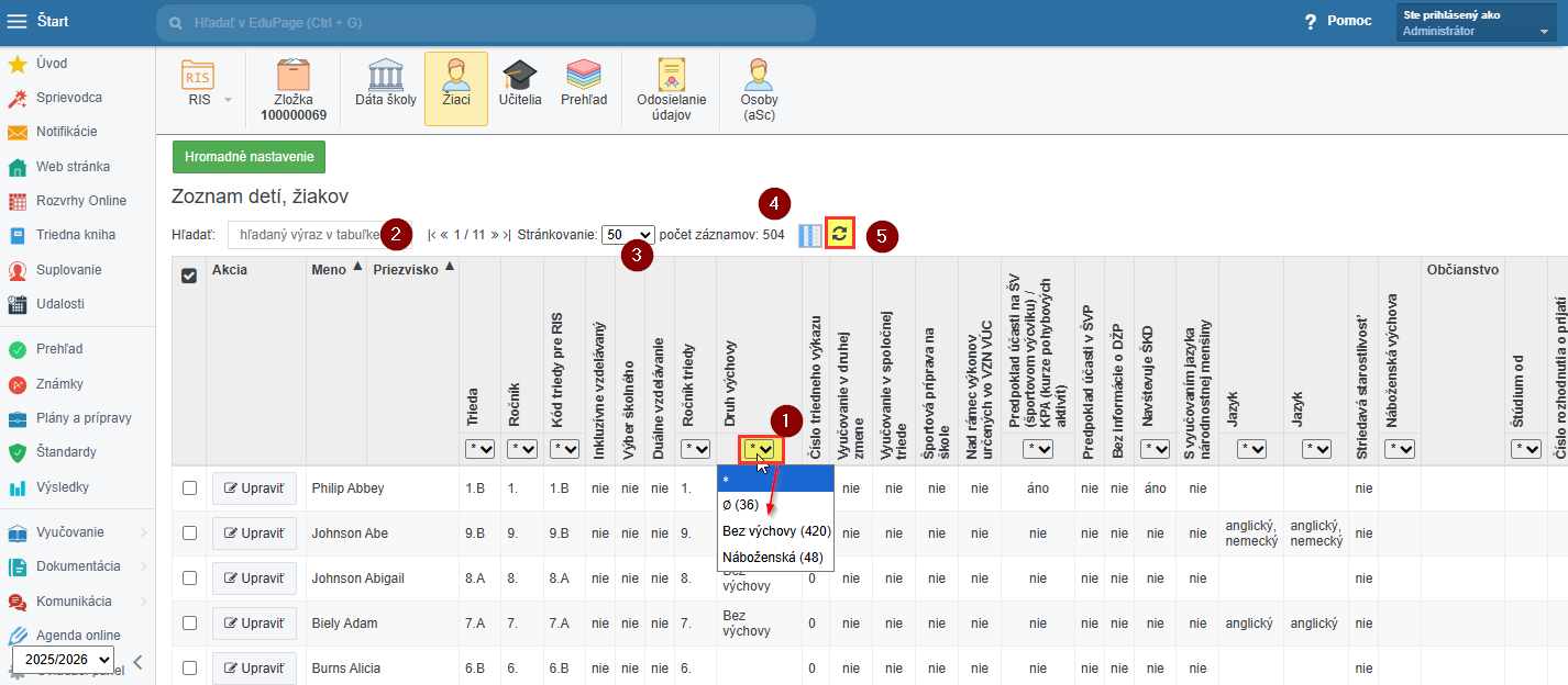 3. Ak chcem pracovať iba s vybranými hodnotami, tak kliknem na rolovacie menu pod názvom stĺpca (1). Konkrétnu osobu viem hľadať pomocou vyhľadávacieho poľa (2). Ak chcem na stránke mať zobrazených viac záznamov, tak si nastavím vyšší počet (3). Zároveň mám stále prehľad koľko záznamov edupage eviduje (4). Ak chcem obnoviť pôvodný pohľad na tabuľku, tak kliknem na dve šípky v smere hodinových ručičiek (5).