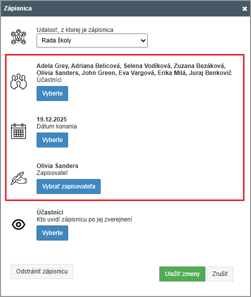 Pri vytváraní zápisnice ste zvolili účastníkov rady školy spomedzi učiteľov a rodičov (účastníkov, ktorí majú vytvorené EduPage konto).