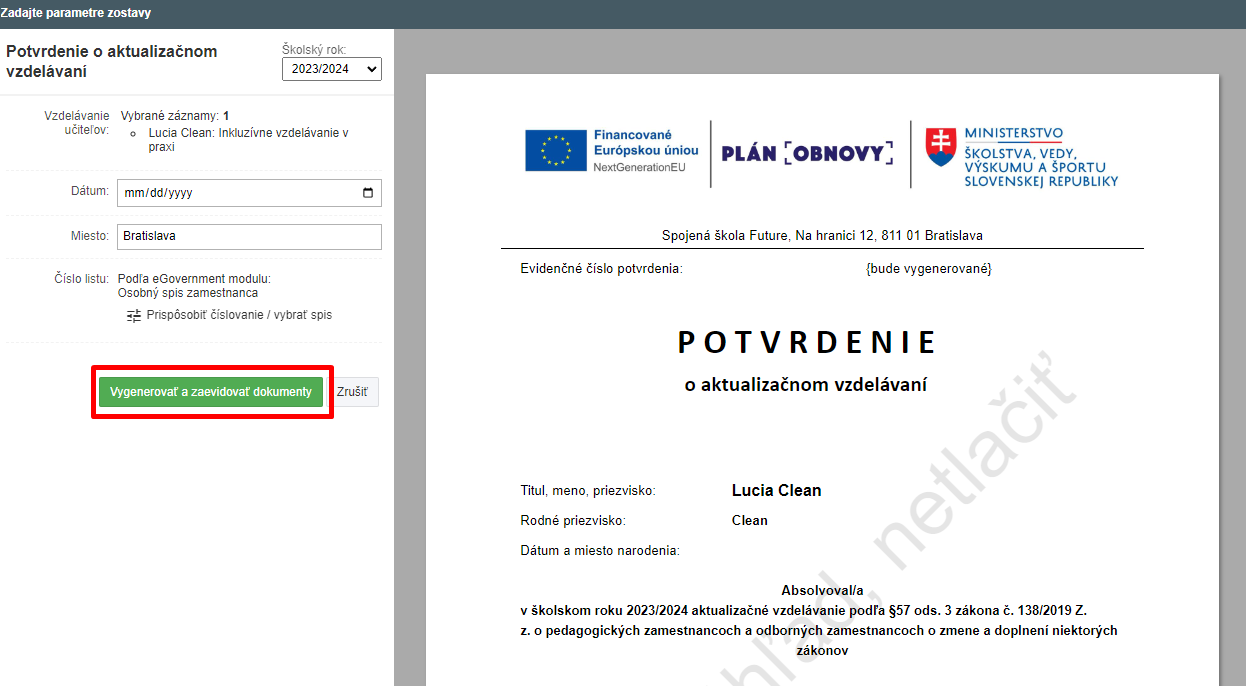 Zvoľte Vygenerovať a zaevidovať dokumenty. EduPage automaticky pridelí každému potvrdeniu číslo záznamu, ktoré nasleduje v osobnom spise každého učiteľa a zaradí ho do jeho osobného spisu.