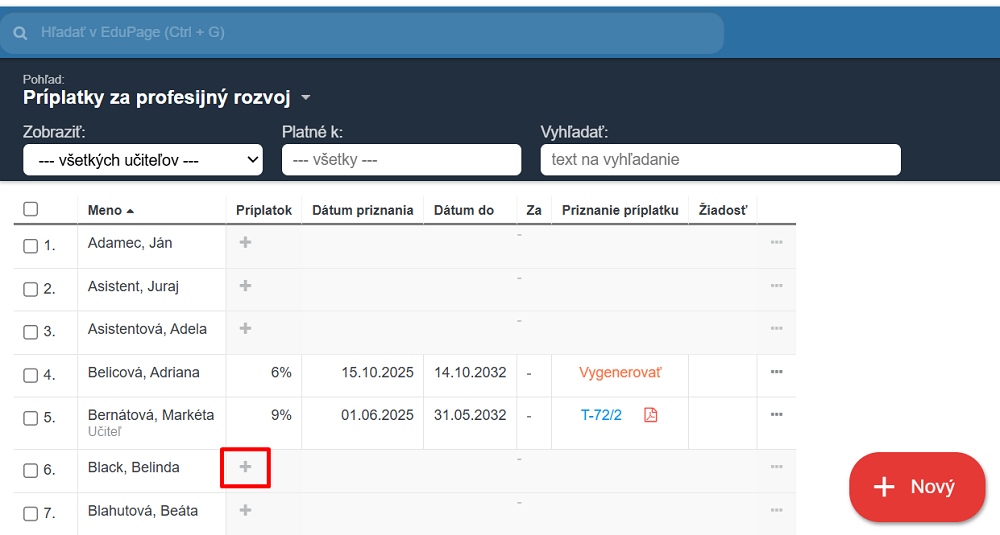 Zamestnancovi zadajte výšku príplatku za profesijný rozvoj cez znamienko plus pri jeho mene alebo kliknite na "Nový"
