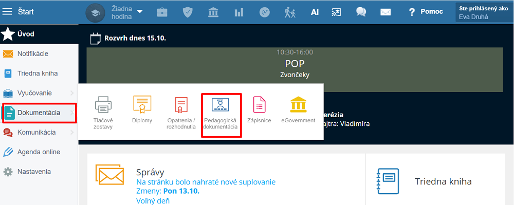 V ľavom menu vyberte Dokumentácia, Pedagogická dokumentácia.