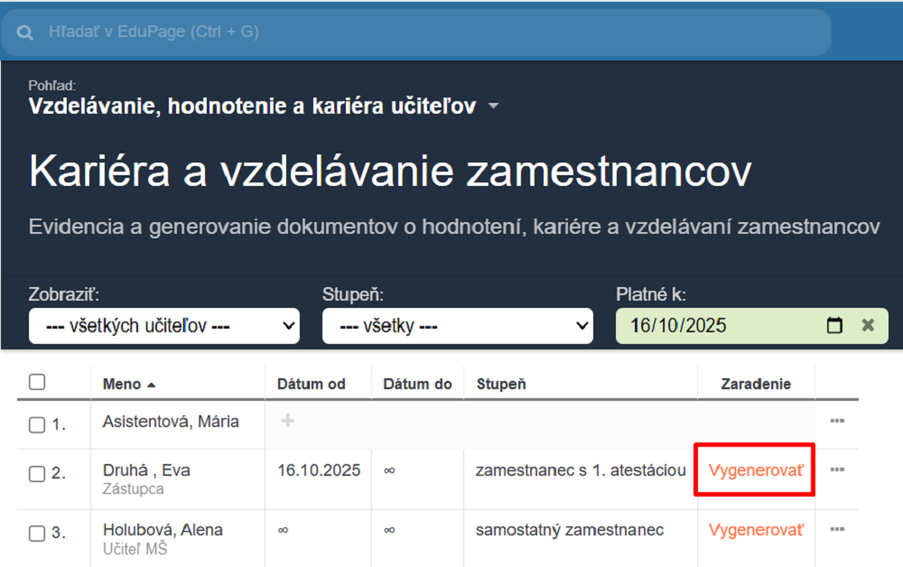 Zaradenie pedagogického zamestnanca do kariérového stupňa vygenerujete cez Pedagogickú dokumentáciu v sekcii Vzdelávanie, hodnotenie a kariéra učiteľov.