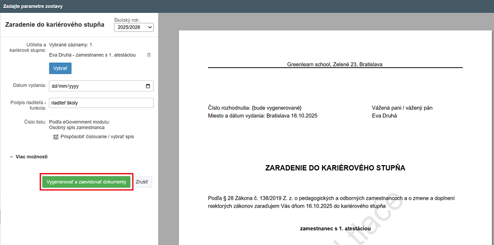 Ako vygenerovať Zaradenie zamestnaca do kariérového stupňa?