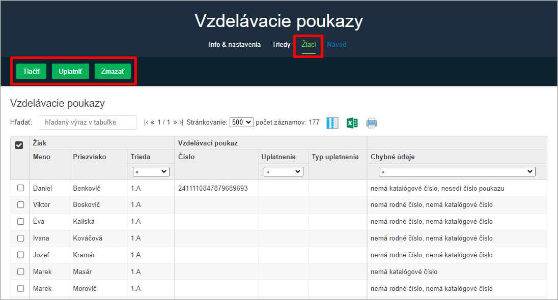 V pohľade Žiaci je možné filtrovať po triedach a iných údajoch a taktiež vytlačiť poukazy, uplatniť ich alebo zmazať.