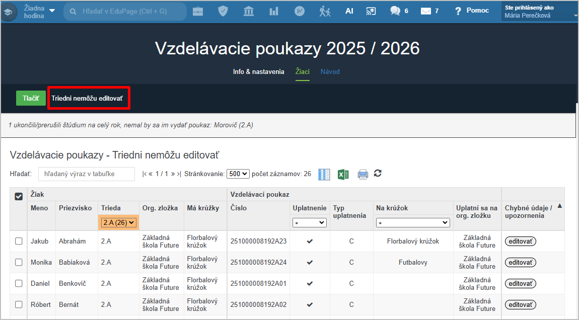 Štandardne triedny učiteľ nevie administrovať VP. Triedny učiteľ bez práva na vzdelávacie poukazy