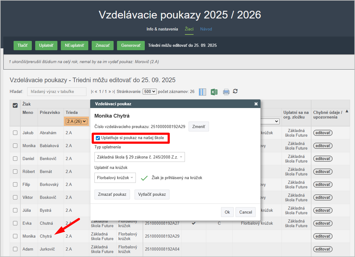 Uplatniť VP vie aj po jednotlivých žiakoch. Dvojklikom sa otvorí záznam žiaka. Tu sa zvolí uplatňuje a vyberie krúžok, na ktorý si žiak uplatňuje VP.