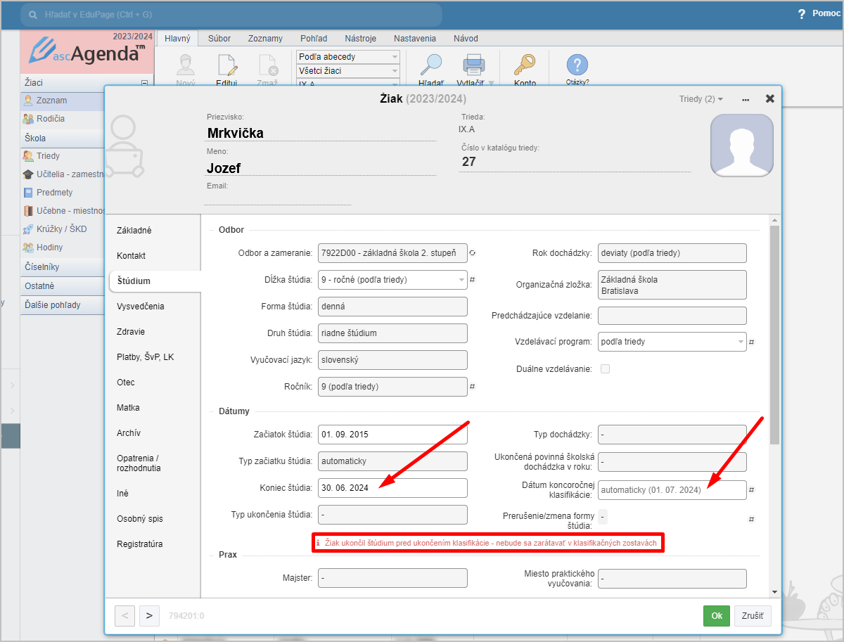 Pokiaľ tieto dátumy nie sú správne nastavené, aj na karte žiaka môžete vidieť, že tu svieti upozornenie, že žiak má nastavené ukončenie štúdia pred dátumom klasifikácie. Takíto žiaci sa do štatistík nezapočítavajú. Treba upraviť dátum klasifikácie a dať dotknutým triedam znova prepočítať štatistiky.