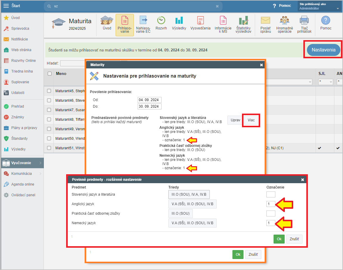 V okne Nastavenia pre prihlasovanie na maturity kliknite na tlačidlo Viac.
