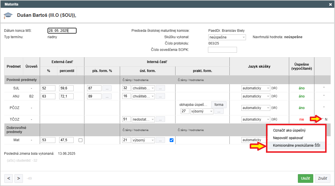 V prípade úspechu vygenerujte študentovi maturitné vysvedčenie, načíta sa tam nový výsledok komisionálne preskúšaného predmetu.