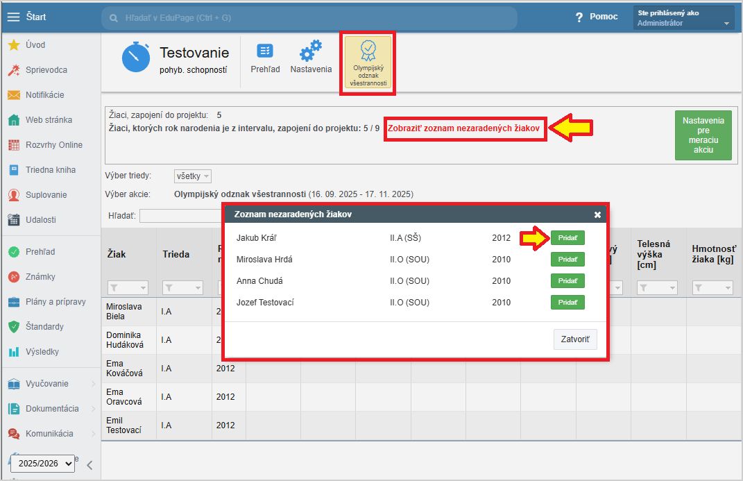 Poznámka: Učiteľovi viete nastaviť právo aj na administáciu tohto modulu, aby mohol pridávať ďalších žiakov do meracej akcie.