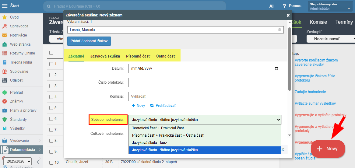 V návode nižšie nájdete postup, ako vytvoriť nový záznam záverečnej (jazykovej) skúšky, vybrať spôsob hodnotenia a uložiť všetky údaje potrebné pre jazykovú školu.