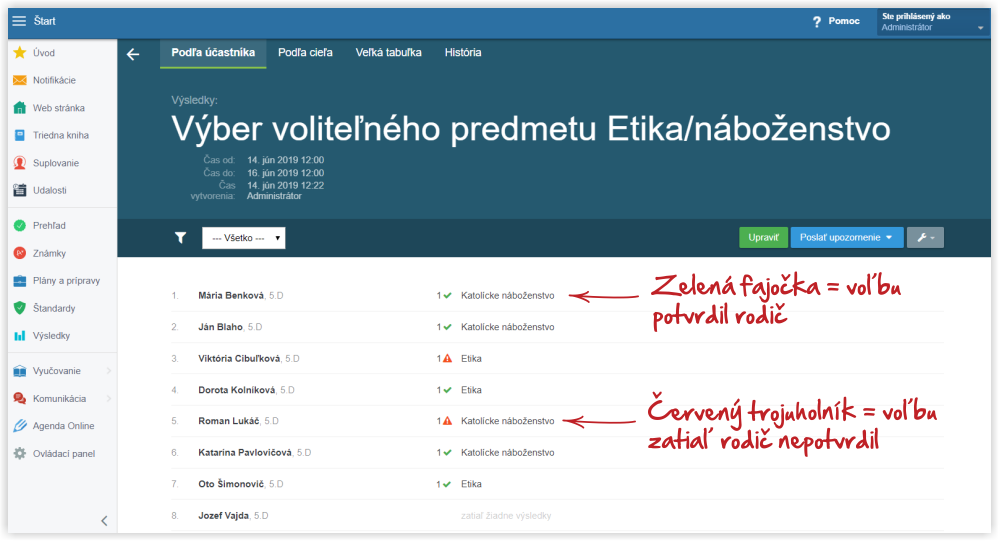 Ak je prihlásenie potvrdené rodičom, vo výsledkoch sa zobrazuje zelená fajočka. Ak voľba potvrdená nie je, svieti červený trojuholník.