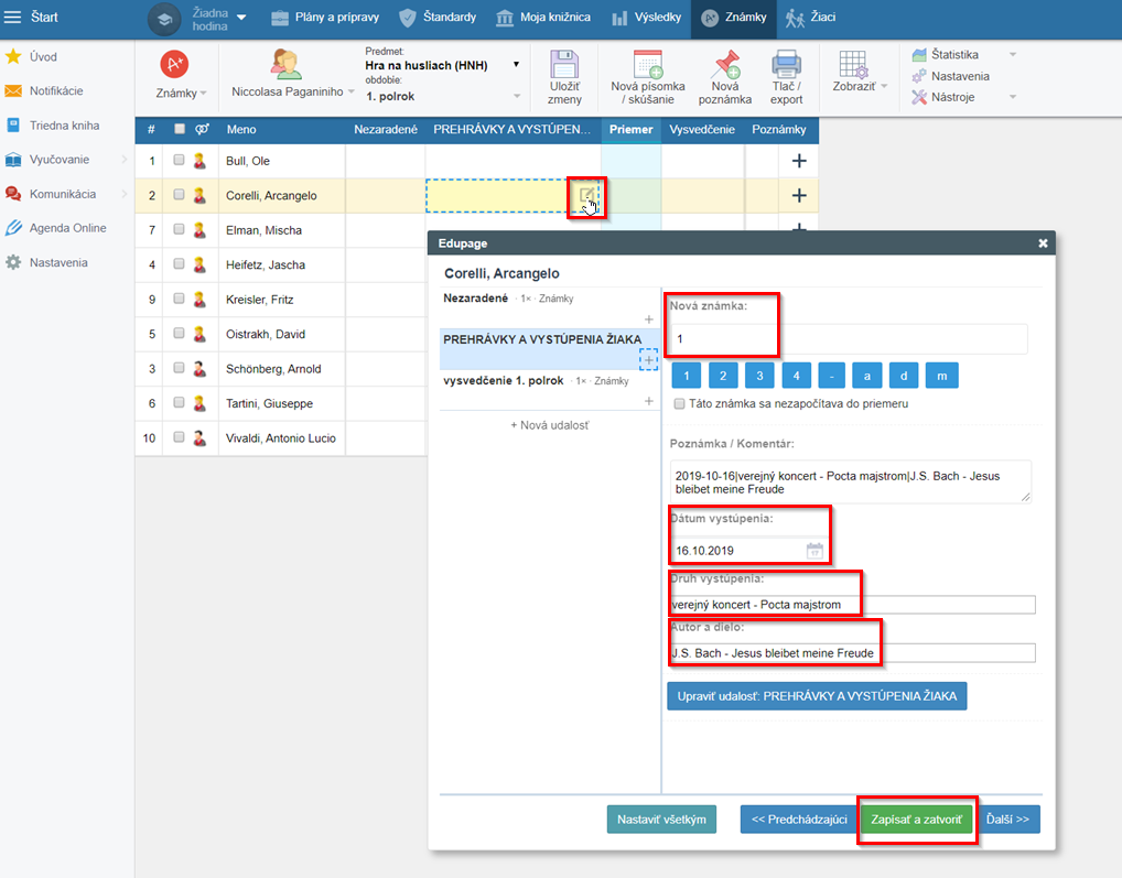 Pre zadávanie prehrávok a vystupení žiaka (tieto informácie o koncerte sa zobrazia v tlačive triednej knihy pre individuálne vyučovanie v ZUŠ) je potrebné aby ste prihlásili na EduPage stránku školy ako učiteľ a zvolili položku Známky: