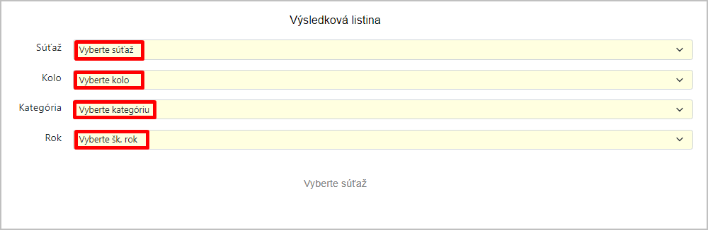 Zobrazí sa nástroj, v ktorom je možné si vybrať súťaž, kolo, kategóriu, šk. rok a v prípade okresných a krajských kôl aj konkrétny okres a kraj.